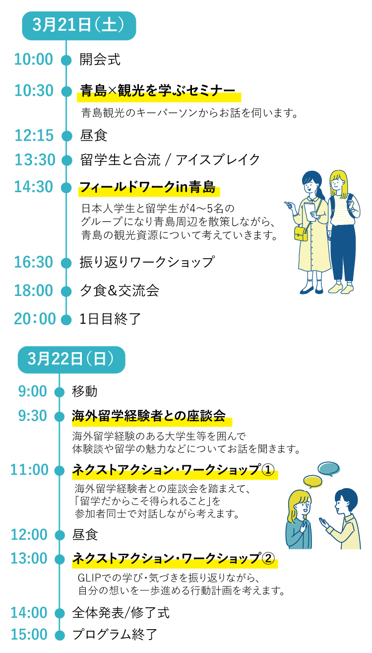 3月21日(土) | 宮崎市青島エリア ※宿泊先は青島フィッシャーマンズビーチサイドホステル&スパ 3月22日(日) | 宮交ボタニックガーデン青島 |